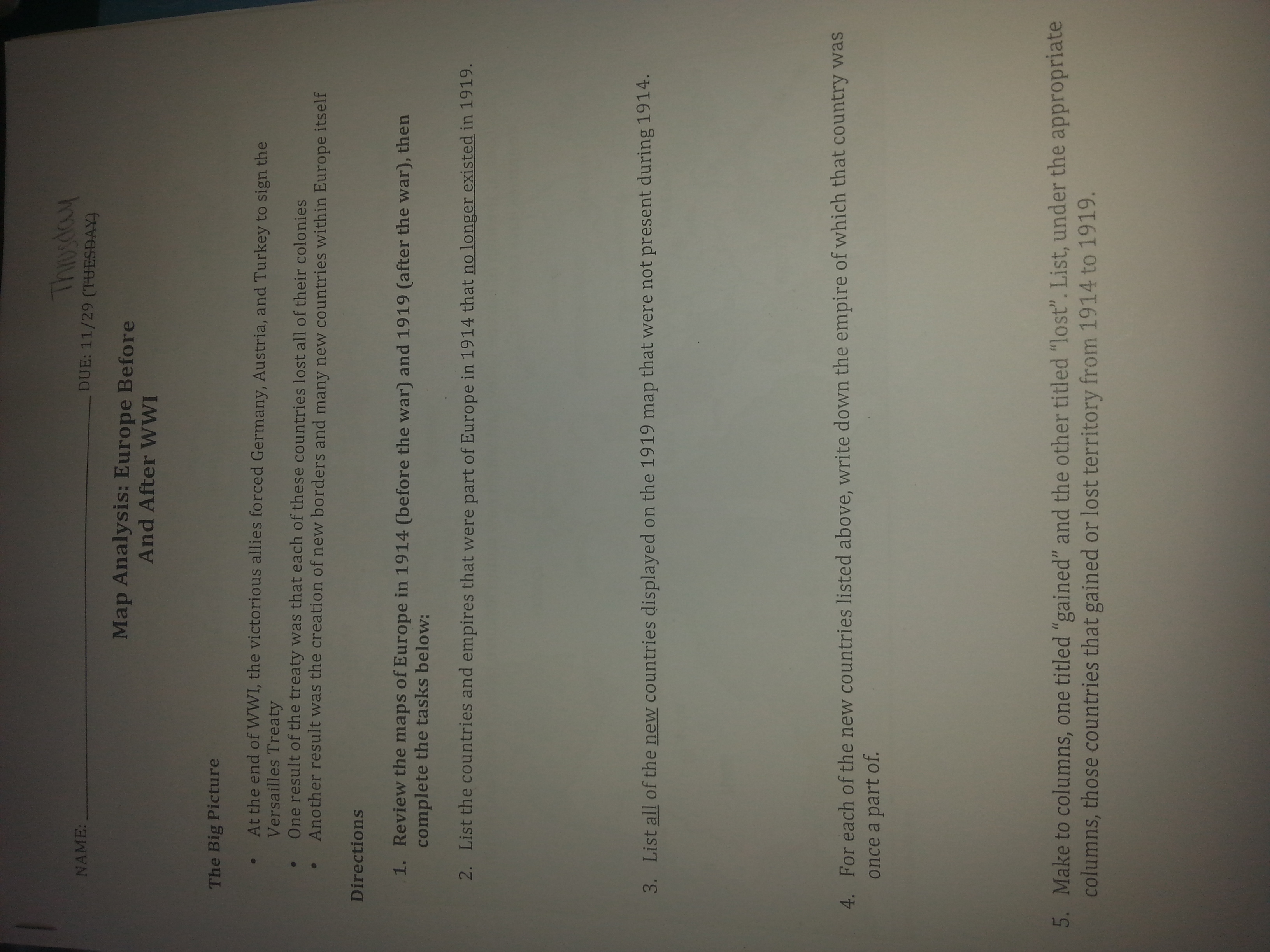 <span>2. List the countries and empires that were part of Europe in 1914 that no longer existed in 1919 Spain, Ottoman Empire, Russia, Austria-Hungary, Montenegrid, Serbia 3. List all of the new countries displayed on the 1919 map that were not present during 1914. <span>Ireland, Finland, Ertonia, Latvia, Lithuania, Prussia, Poland, Soviet Union, Turkey, Czechoslovakia, Yugoslavia, Danzig, Austria, Hungary </span>4. For each of the new countries listed above, write down the empire of which that country was once a part of. <span>Ireland: GB, Finland, Ertonia, Latvia: Russia, Lithuania, Prussia: Germany/Russia, Poland: Russia/Germany/Austria-Hungary, Soviet Union: Russia, Turkey: Ottoman Empire, Czechoslovakia: Austria-Hungary, Yugoslavia: Austria-Hungary/Serbia/Montenegrid, Danzig: Germany, Austria, Hungary: Austria-Hungary </span></span> 5.Make two columns, one titled “gained”and the other titled “lost”. List,under the appropriate columns,those countries that gained or lost territory from 1914 to 1919. Gained: Serbia, Romania, France, Italy Lost:<span> Germany, Russia, Austria- Hungary</span>