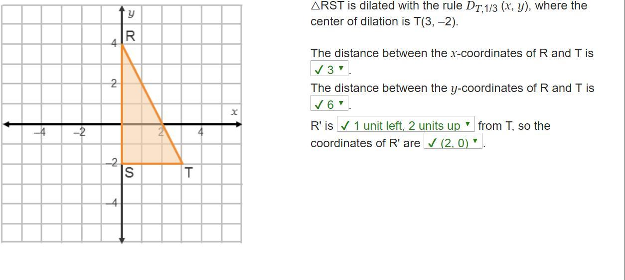 △RST is dilated with the rule DT,1/3 (x, y), where the center of dilation is T(3, –2). The distance between the x-coordinates of R and T is 3. See below.