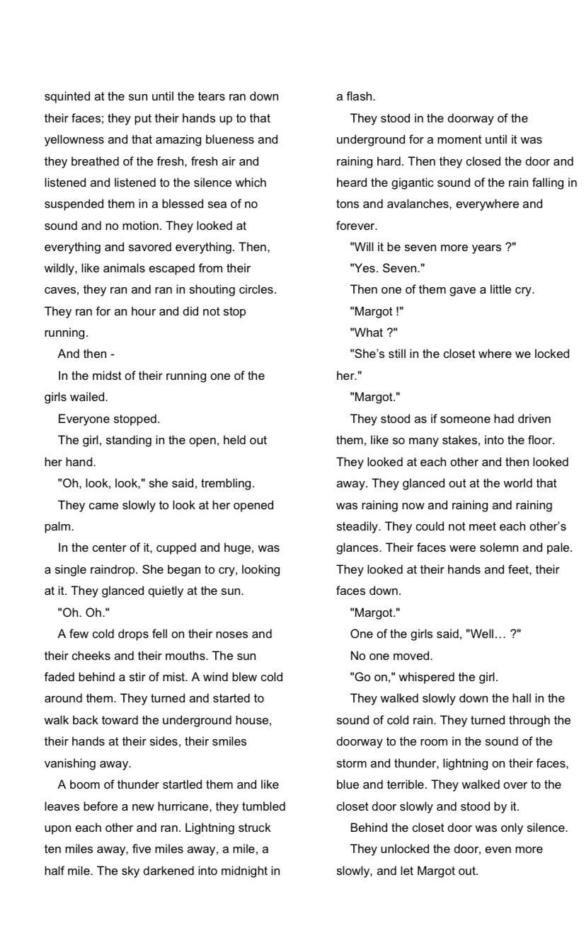 uggling with his or her feelings. Reread the last half of page 4, which is the right side. Are the children facing an internal or external conflict as they walk to the closet and unlock the door? Explain your answer. ( This question is based on the story “All Summer in a Day”)