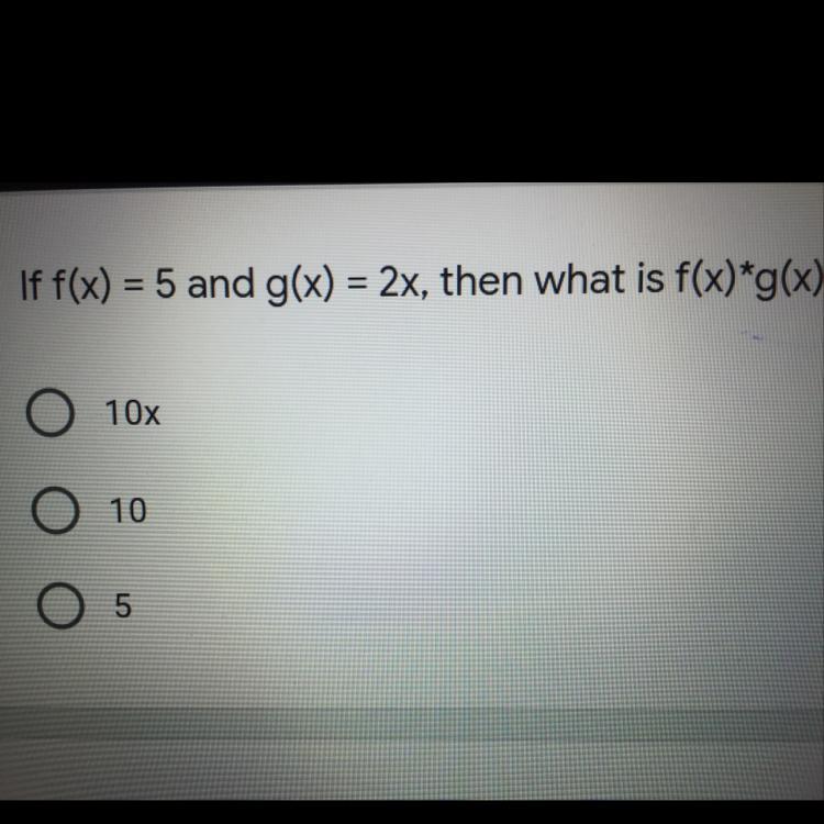 Would be 10x as they tell you what f(x) is and what g(x) is they then ask you to multiply and as these values are equal to 5 and 2x when multiplying the numbers are collected to 10 and x can’t be simplified further so it would stay as x making the answer 10x