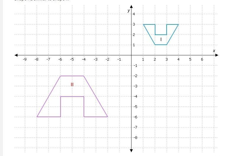 The vertices of shape II are (-4,-2), (-6,-2), (-8,-6), (-6,-6), (-6,-4), (-4,-4), (-4,-6), (-2,-6).