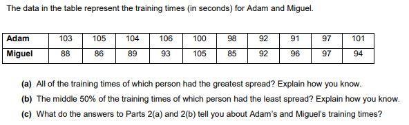 (c) This proves that their is a small variance in Adam's training times, but a large variance in Miguel's training times (Miguel's data is more likely skewed).