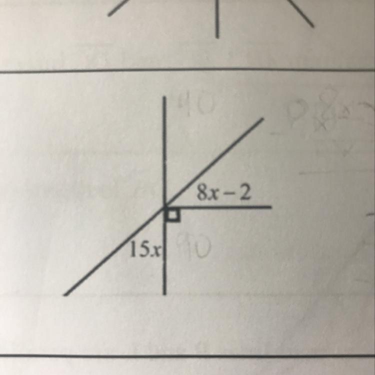 Put together they will make a 90 degree angle so 15x+8x -2= 90 combine like terms you get 23x-2=90 +2= 92= 23x now 92/23 is 4 so x= 4