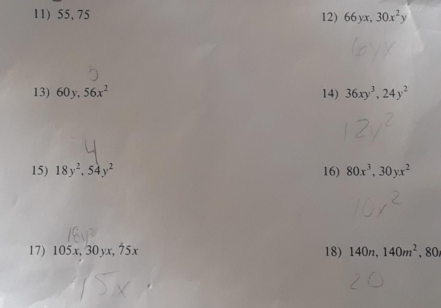 16) 80x^3 + 30yx^2 --) 10x^2( 8x + 3y ) so the greatest common factor is 10x^2.