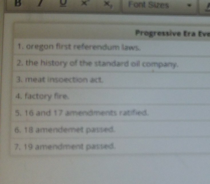 Not sure about 1, but 2. The standard oil company became a huge company that put horizontal AND vertical integration into practice. The company made John D. Rockefeller the richest man alive at the time. 3. The meat inspection act made it a criminal act to mislabel meat that is being sold as food, and ensure that all meat being sold as food is slaughtered under sanitary conditions. The first event that out this process into to play was when Armour & Co supplied the US Army with rotten beef during the Spanish American War. 4. I guess you're talking about the Triangle Shirtwaist Factory Fire? This is significant because it is still one of the largest number of deaths from an industrial accident. The fire may have been an accident, but the number of deaths could have been prevented, for the company did not have a lot of safety precautions taken, there were locked doors all over the building which prevented 145 workers from living. 5. The 16th amendment gave Congress the power to tax income. The 17th amendment enforced the direct election of senators from the people. 6. The 18th amendment prohibited the sale of alcohol. Prohibition was significant because it sparked cultural changes, from people who started "speak-easies" and illegal alcohol sales. 7. The 19th amendment was huge for women, it gave them the right to vote. Women had been fighting for this for a long time. This amendment empowered women to step out to he workplace. I'm sorry if I didn't answer it the way you needed it, but here ya go! ;)