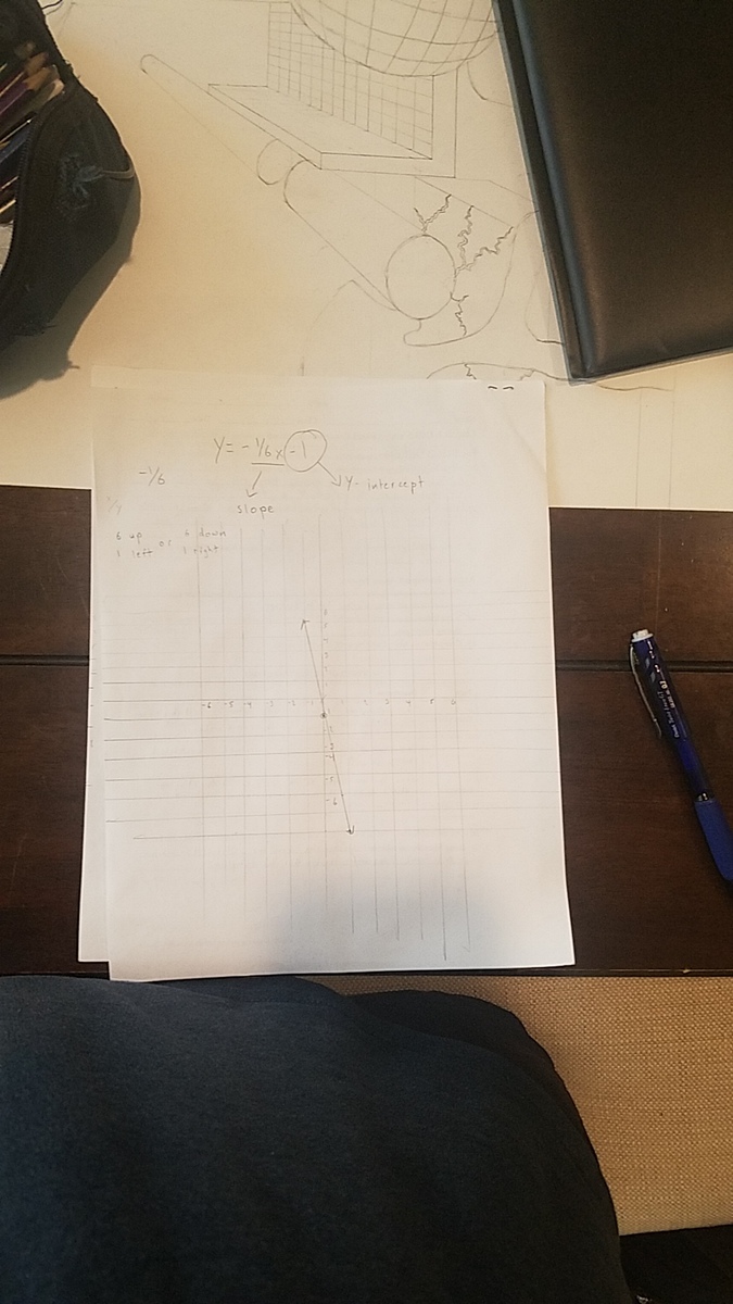 Now the fraction is your slope, it determines where your point goes, in this equation you would move up 6 times and move left once because your slope is -1/6. Now your numerator is the one that moves right if it's positive or left if if's negative. Your denominator is the one that moves up if it's positive and down if it's negative. So you're either going up 6 times and moving left once and if you're plotting two points then you move down 6 times and right once, it's basically the reverse. Now the number on the very right is your y-intercept it's always on the y-axis and that's how you start your line. from there you use the slope and plot the two other points and then you connect the points. That's how you do it, hope this helps.