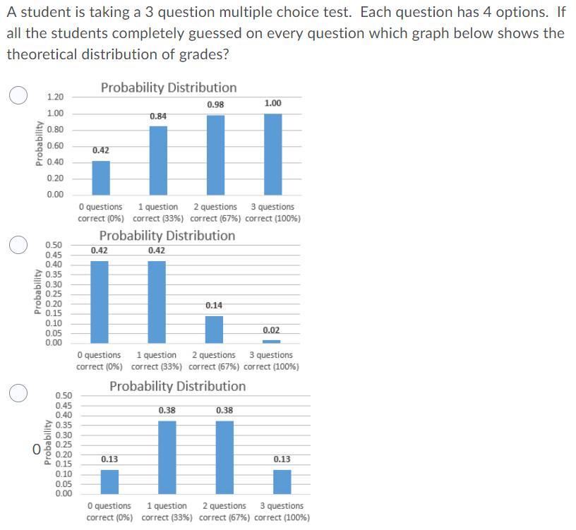 Then, the probability to having one question correct by selecting an option at random is 1/3 = 0.25.