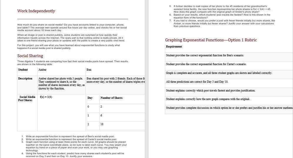 Description Amber shared her photo with 3 people. They continued to share it, so the number of shares increases every day as shown by the function. Ben shared his post with 2 friends. Each of those friends shares with 3 more every day, so the number of shares triples every day. Carter shared his post with 10 friends, who each share with only 2 people each day.