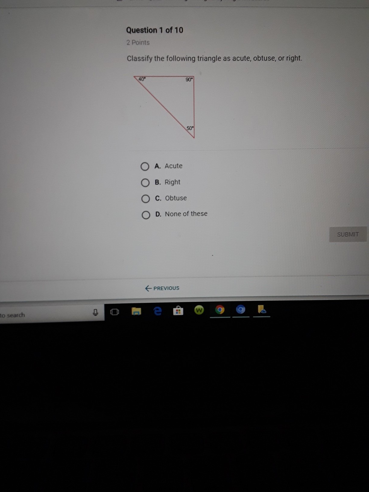 The following picture is a example of a "right triangle" or option B. Right triangles have 90 degree angles and look like a L, if you rotate the triangle to its base you would see that the 90 degree angle looks like a L making it a right triangle. It's not option A because acute angles have to be smaller then 90 degrees in order for it to be acute, it's not obtuse because the angle has to be greater then 90 degrees in order to be a obtuse triangle.