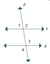 Let us consider that c is parallel to d and p is the transversal, then using the properties of parallel lines, we have