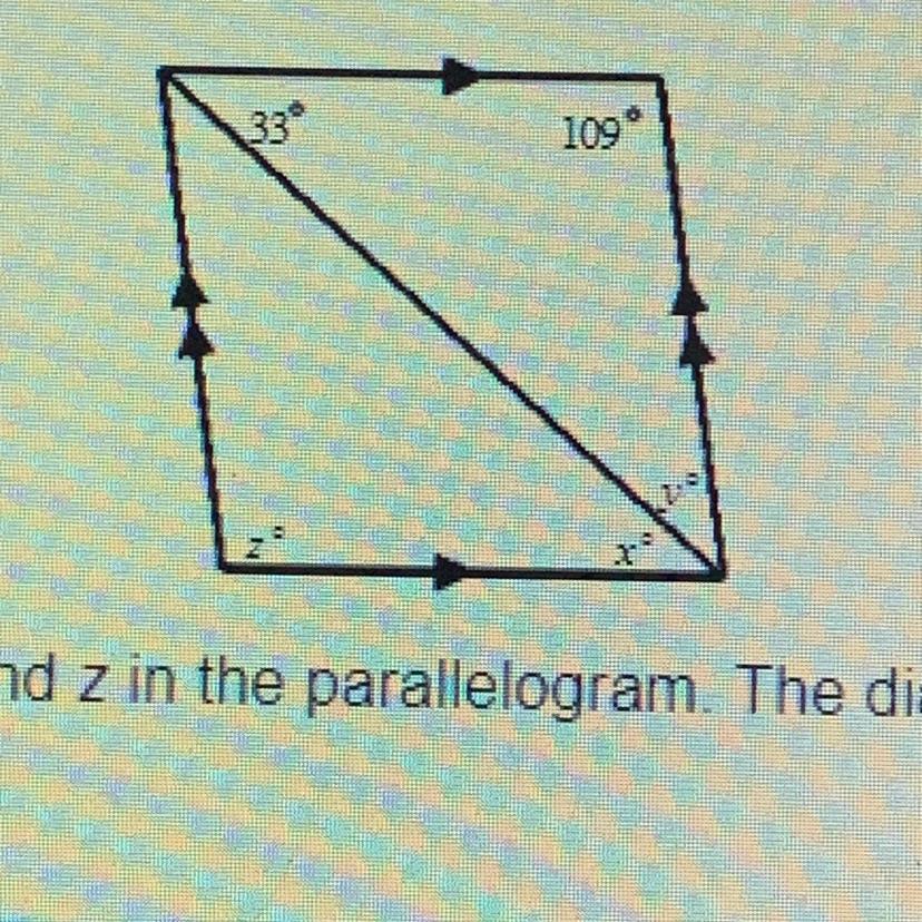 ii) from properties of parallelogram that a pair of opposite angles are equal, Therefore z = 109°.