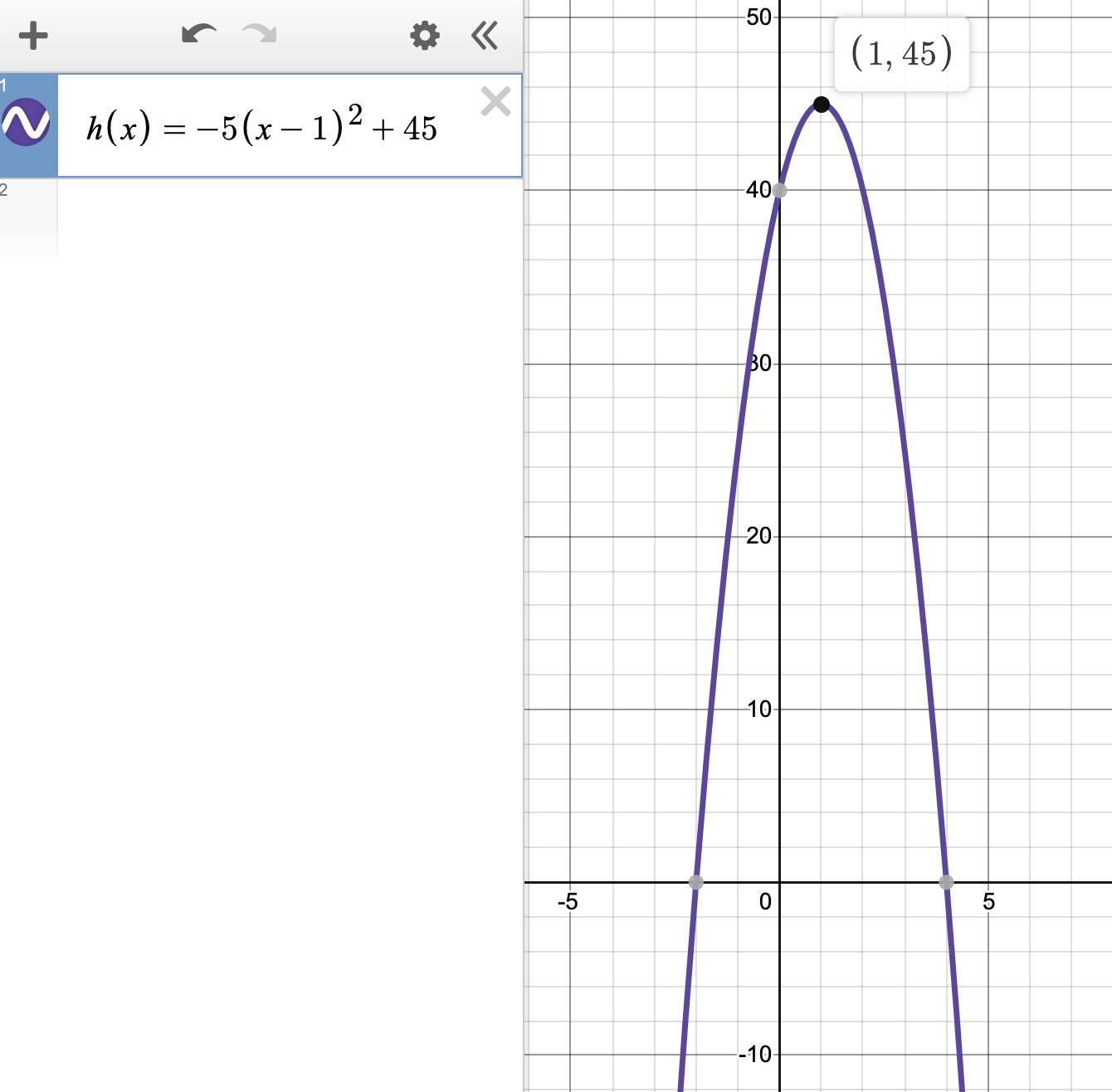 The negative value of 'a' tells you the parabola opens downward, so the y-value of the vertex is the maximum value of the function: 45.