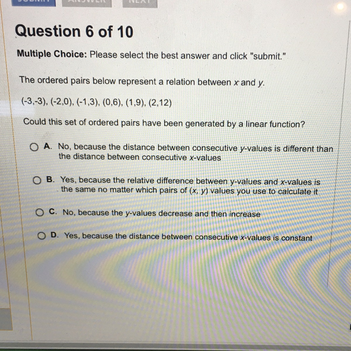 So, the given relation is a linear function because the relative difference between y values and x values is the same no matter which pairs of (x,y) you use to calculate it