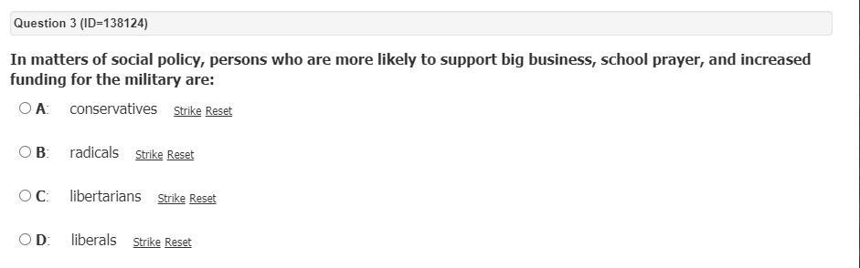 In matters of social policy, persons who are more likely to support big business, school prayer, and increased funding for the military are the "conservatives".