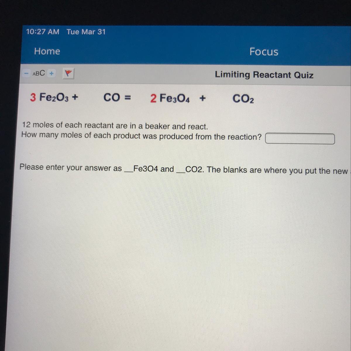 For 3 moles Fe2O3 we need 1 mol CO to produce 2 moles Fe3O4 and 1 mol CO2