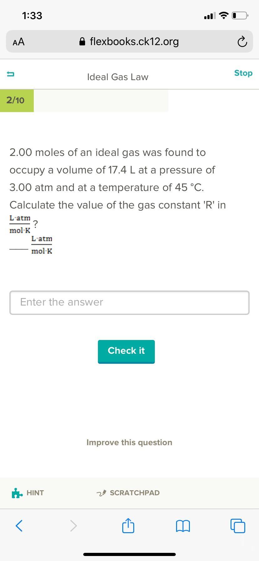 \begin{array}{rcl}pV & = & nRT\\\text{3.00 atm} \times \text{17.4 L} & = & \text{2.00 mol} \times R \times \text{318.15 K}\\\text{52.2 L$\cdot$atm} & = & 636.30R \text{ K$\cdot$mol}\\R & = & \dfrac{\text{52.2 L$\cdot$atm}}{636.30 \text{ K$\cdot$mol}}\\\\ & = & \textbf{0.0820 L$\cdot$atm$\cdot$K$^{-1}$mol}^{-1} \\\end{array}\\\text{The value of the gas constant R is $\large \boxed{\textbf{0.0820 L$\cdot$atm$\cdot$K$^{-1}$mol}^{-1 }}$}