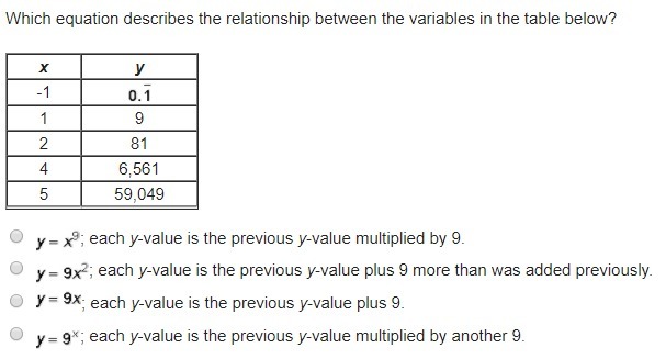 Therefore, the answer is D) y = 9^x, each y value is the previous y-value multiplied by another 9.