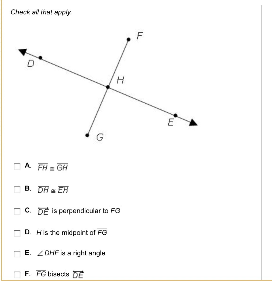 Since we have not been given that FG also bisects DE, therefore option F is not a correct choice.