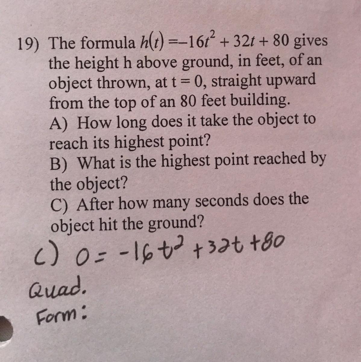 To find the answer for part C: the time to hit the ground, we solve for the variable "t" in the given expression for the height, by setting the height to zero (object touching the ground) and using the quadratic formula: