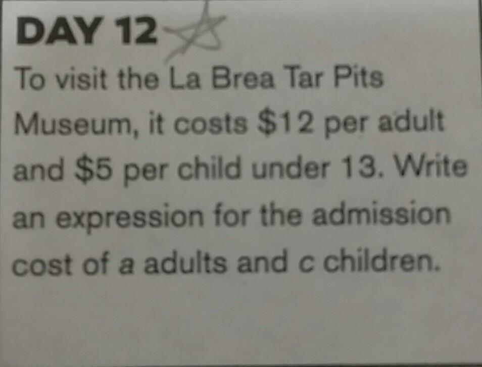 Well the equation would be 12a+5c because the people would be multiplied by their cost and added if theyre going together