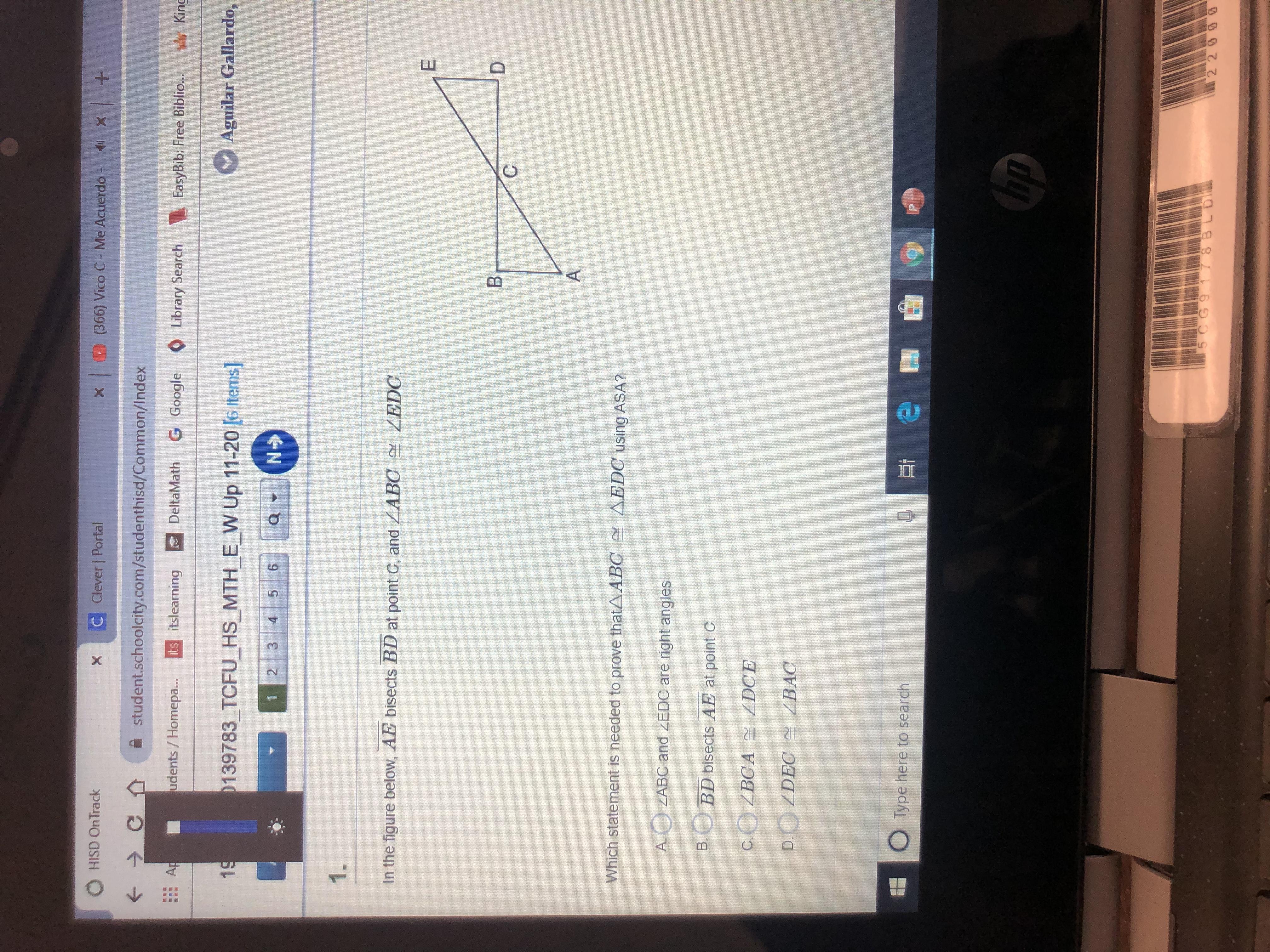 In order to use ASA congruence, you need to show congruence of angles on either side of a congruent segment. (Angle - Side - Angle) Considering the left side of the figure, you have given that ∠B is congruent to its counterpart, side BC is congruent to its counterpart. So, you need to show the angle at C is congruent to its counterpart. That is, you must show ...