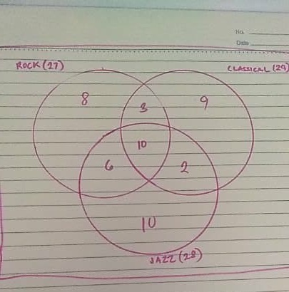 In summary: 8 liked only Rock, 9 liked only Classical, 10 liked only Jazz.