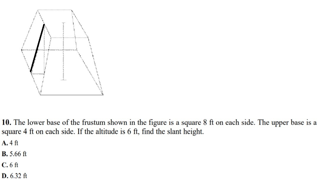 <span>this answer is based on the fact that the inclined height should be greater than 6 and that is the only option available</span>