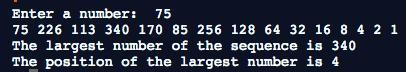 ts an integer k such that . Write a program that prompts the user to input the value of x. The program outputs the integer k such that and the numbers . (For example, if , then , and the numbers , respectively, are 75, 226, 113, 340, 170, 85, 256, 128, 64, 32, 16, 8, 4, 2, 1.) Test your program for the following values of x: 75, 111, 678, 732, 873, 2048, and 65535.