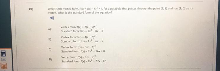 In this case, the vertex of the parabola is at (1, 0). Replacing this information into the equation we get:
