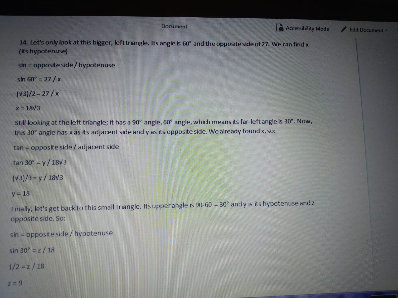 13. Now things get a little trickier. We are given an angle of 30° and the opposite side of 17. We need to find the adjacent side (x).