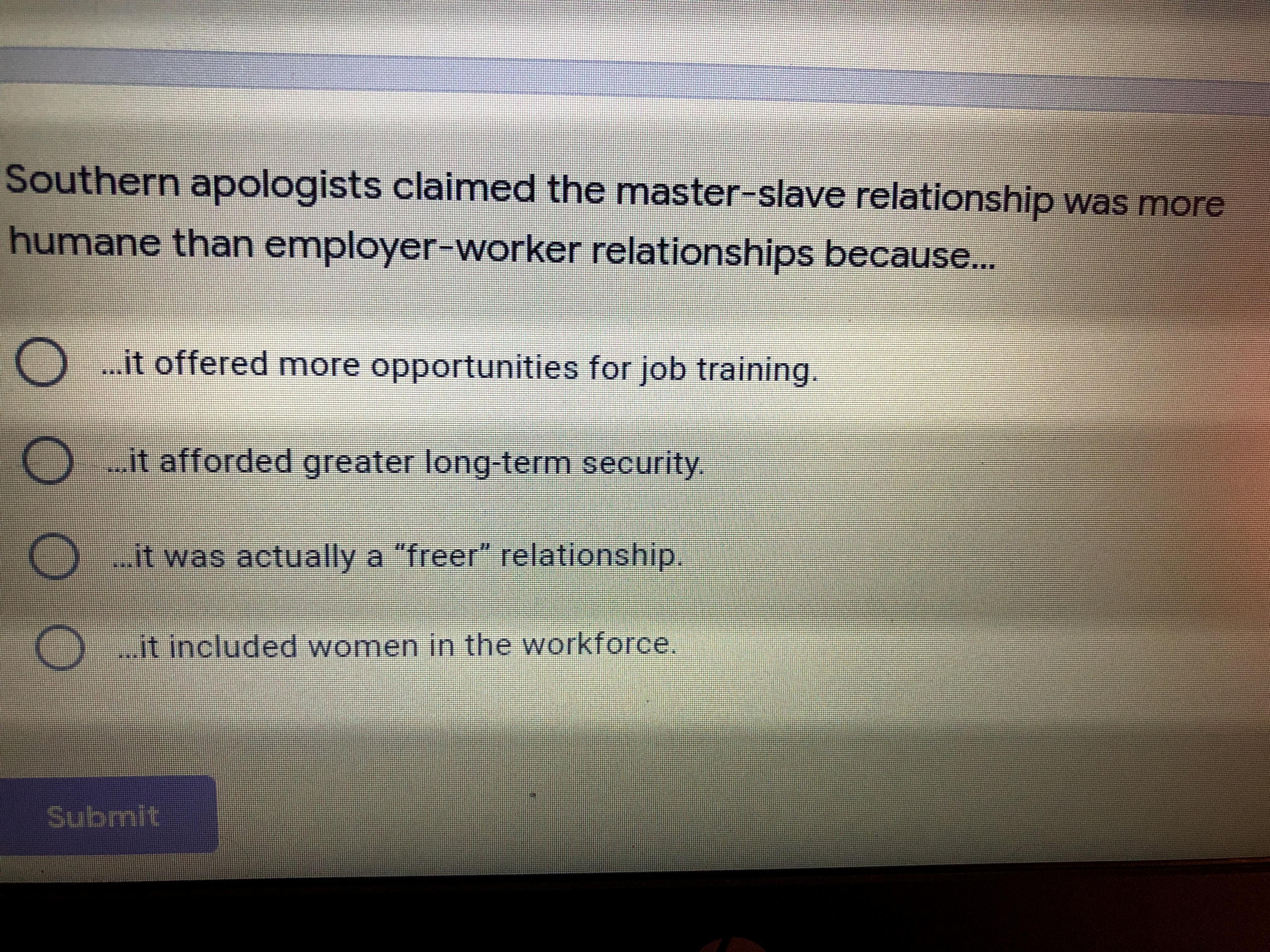 <em>it was actually a "freer" relationship</em> – this is not the correct answer. The southern apologists didn’t claim slaves were freer in this type of relationship, just that it was better for them.