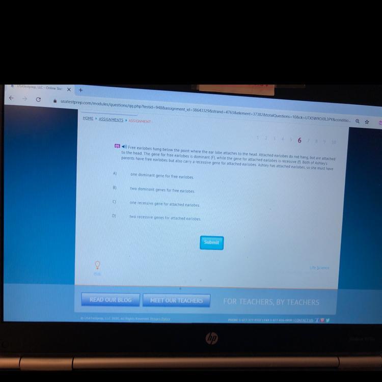 For a recessive trait to be displayed, it must mean that the individual does not possess a dominant allele that would be expressed instead of the recessive allele. Therefore, Ashley must have two copies of the recessive genes to have attached earlobes. Possessing one or two dominant genes for free earlobes would mean that she would have free earlobes.