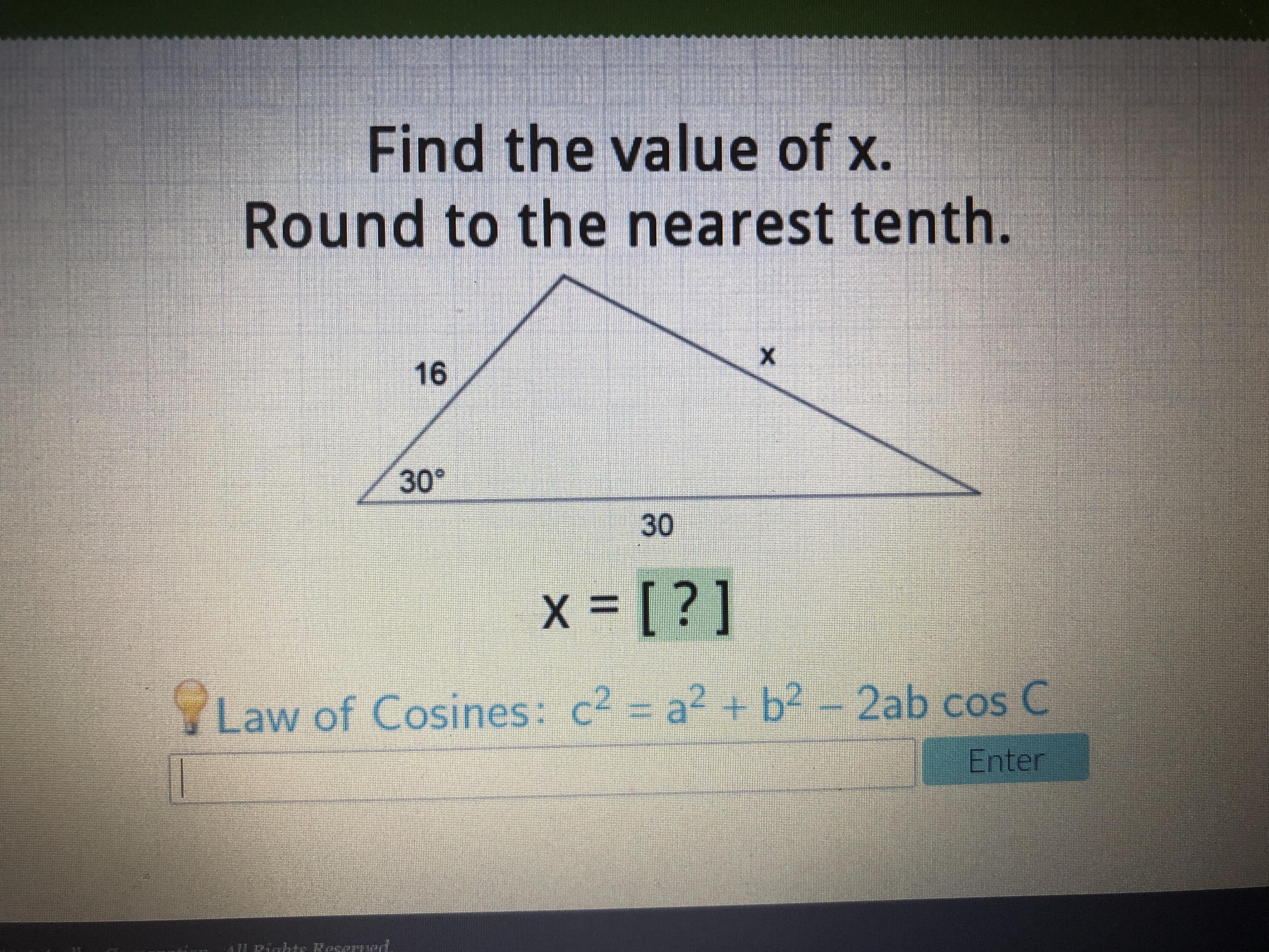 x^2 = 30^2 + 16^2 -2(30)(16)cos(30\°)
