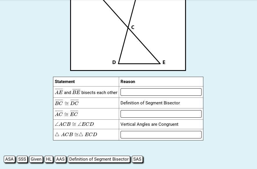 4th line: SAS (or side angle side) You have an angle, a side, and an angle all in order. Therefore it's SAS.