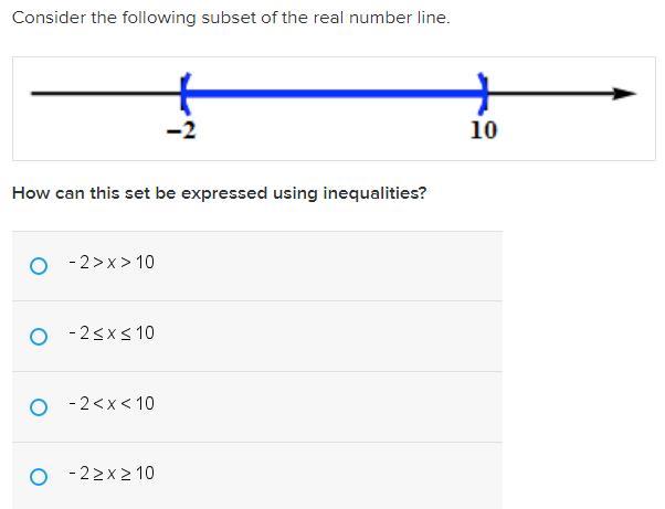 Since x is between -2 and 10, it is greater than 2 and less than 10. You also know that the answer is option C and not B, because in the picture the blue line is rounded at the -2 and 10 marks, meaning that it does not quite reach them. Hope this helps!