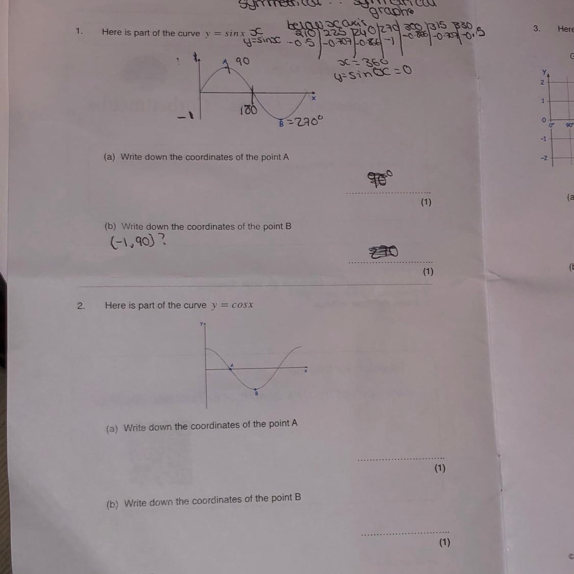 in question 1, we see that point A is located at the top most part of the curve, by observation 1, we can conclude that the y-value must be the maximum value of 1.
