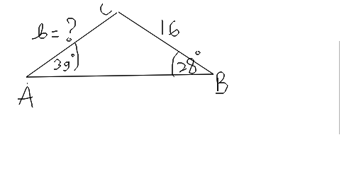 Firstly, solve for the value of angle C by using the concept that the sum of the three angles of a triangle should be 180 degrees. C = 180 - (A + B) = 180 - (39 + 28) = 113 degrees After which, use the concept of sine law which state that the ratio of sine of the angle to the side opposite to it should be equal, (sin A / a) = (sin C / c) ; (sin 39 / 16) = (sin 113 / c) Solving for c gives an answer of c = 23.40.