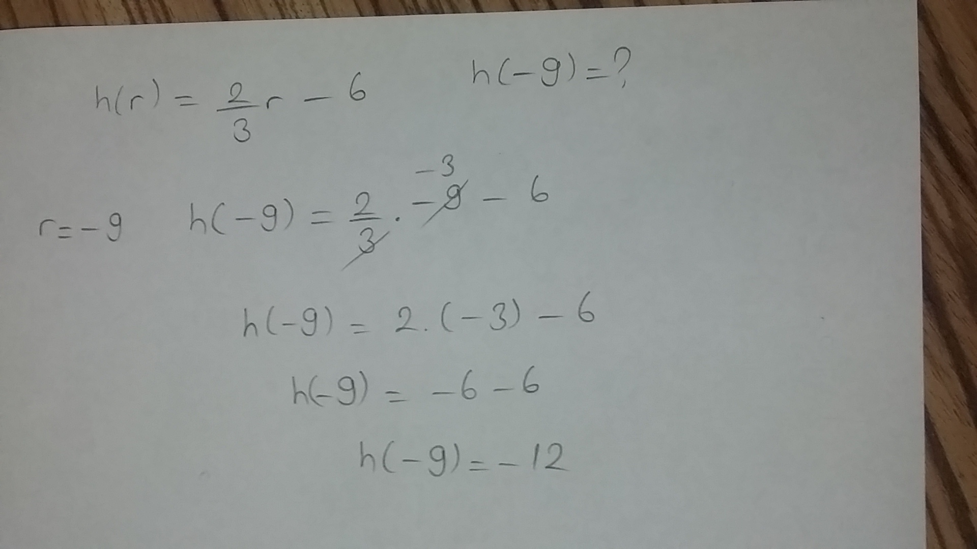 h(-9)\\\\=\dfrac{2}{3}\times(-9)-6\\\\\\=2\times(-3)-6\\\\=-6-6\\\\=-12.