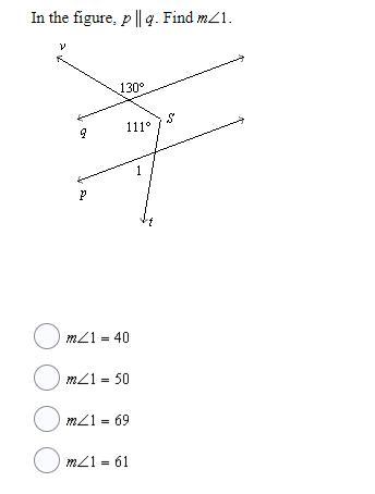 This is a little hard to explain without drawing a diagram .. but if you extend live vs until it intersects line p, you can form a triangle. Using corresponding angles rule for parallel lines, you have the exterior angle of the triangle with line p is 130, meaning the interior angle is 50 (angles on a straight line add to 180). Similarly, the interior angle of the triangle at S is 180 -111 = 69. So the two interior angles add to 50+ 69 = 119. Lastly, angle 1 is equal to the third interior angle of this triangle (due to vertically opposite angles being equal), so since angles in a triangle add to 180, angle 1 = 180 -119 = 61.