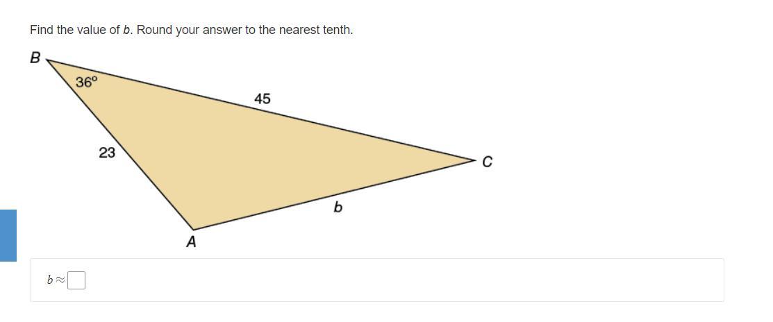 b^2 = (45^2) + (23^2) - 2(45)(23)(cos 36°)