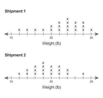 A grocery store received two shipments of watermelon. Each watermelon in a shipment was weighed, then a line plot was made of all of the weights in a shipment. What statement about the two plots’ distributions is true?
