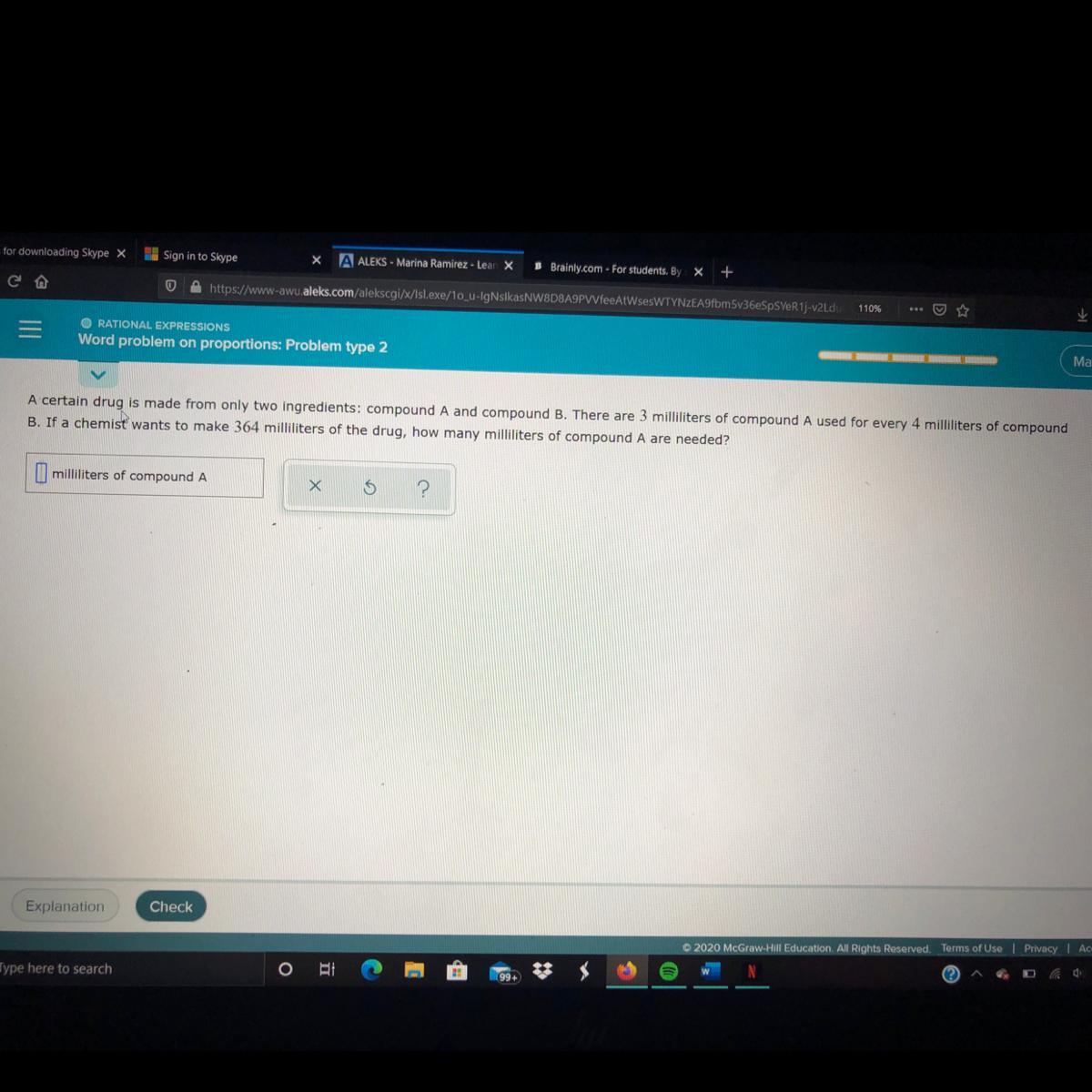 To calculate how many ml of A used in a 364 ml drug we can divide 364 by 7