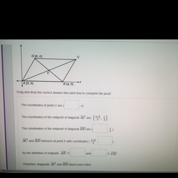 *AC¯¯¯¯¯ and BD¯¯¯¯¯ intersect at point E with coordinates ( a+b over 2, c over 2)..