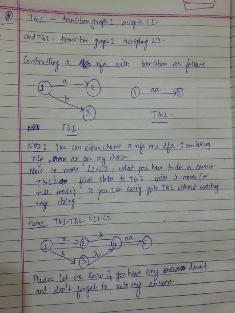 c)Given a TG, called TG1, that accepts the language L1 and a TG, called TG2, that accepts the language L2, show how to build a n