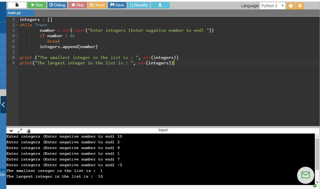 The first print() statement uses min() function which computes the minimum value in the list integers.