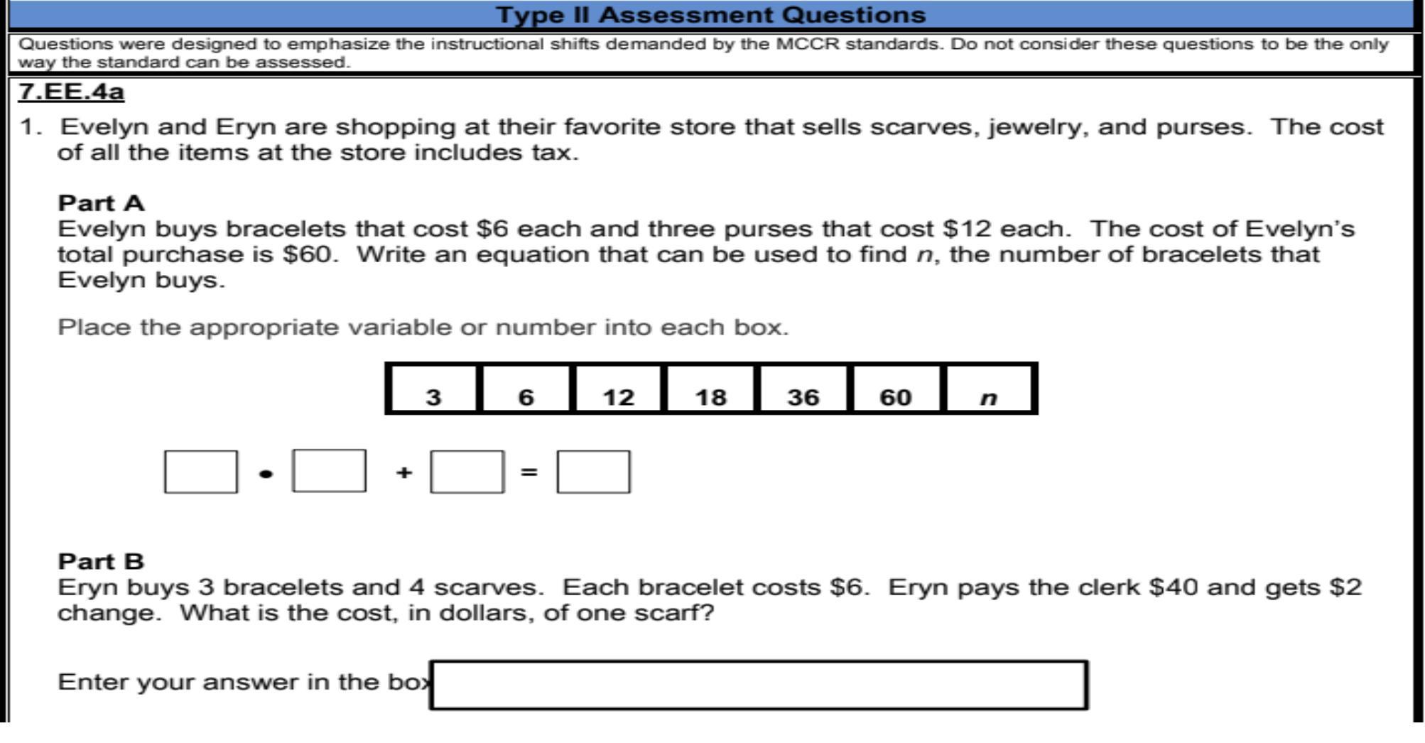 Hello there friend! For part A, an equation that could be used to find the number of bracelets is 12 x 3 + 6n = 60.