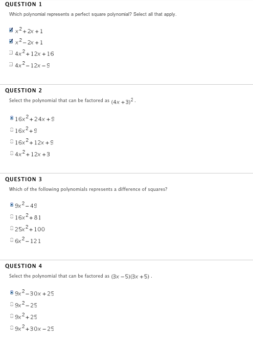 First 3 questions are correct. *remember for a trinomial to be a perfect square 1) first term is a perfect square 2) third term is a perfect square 3) middle term is eight 2 or -2 time the product of the square roots of the 1st and 3rd term last question is incorrect. (3x - 5)(3x + 5) * notice the different signs 9x² + 15x - 15x - 259x² - 25