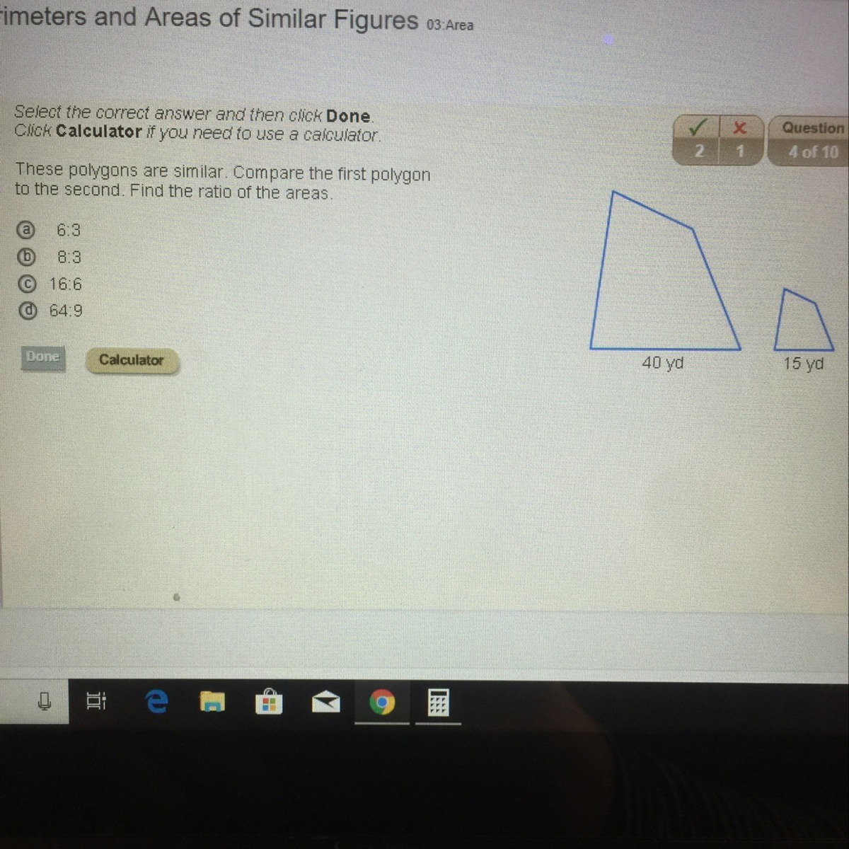 The polygons here have a scale factor of and is simplified to 8/3. Their areas will be 8/3 squared or 64/9.