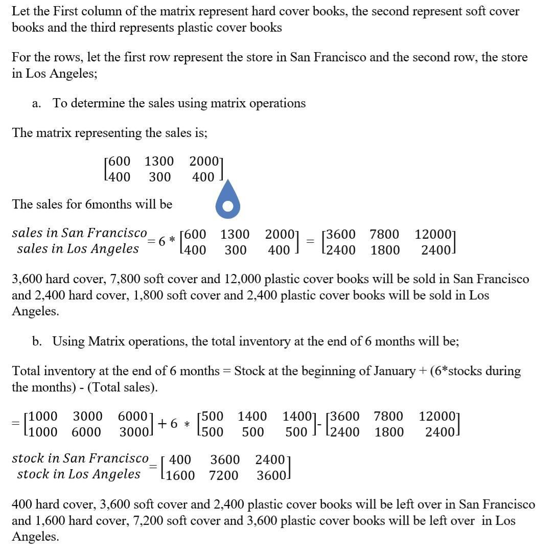Answer:A. 3,600 hard cover, 7,800 soft cover and 12,000 plastic cover books will be sold in San Francisco and 2,400 hard cover, 1,800 soft cover and 2,400 plastic cover books will be sold in Los Angeles.