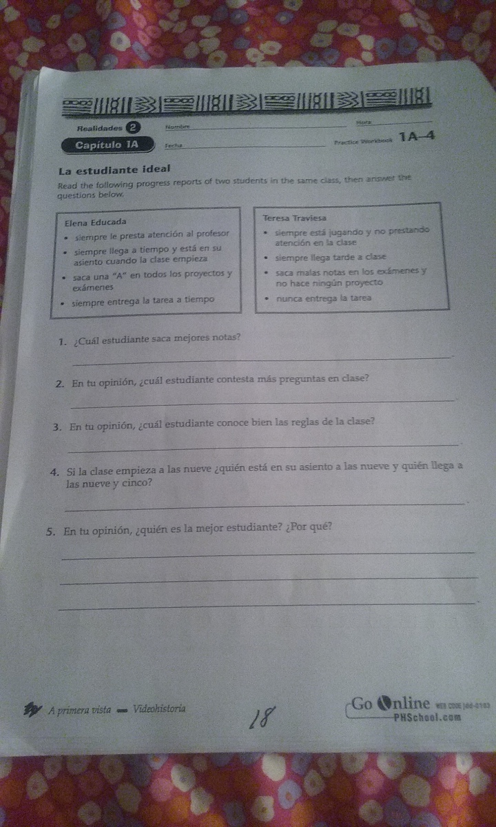 1. Elena saca mejores notas. 2. Yo creo que Elena contesta mas preguntas: Teresa no presta mucha atencion en la clase 3. Yo creo que Elena las conoce mejor. 4. Teresa llega tarde y Elena llegua a las nueve 5. Creo que Elena es la mejor estudiante